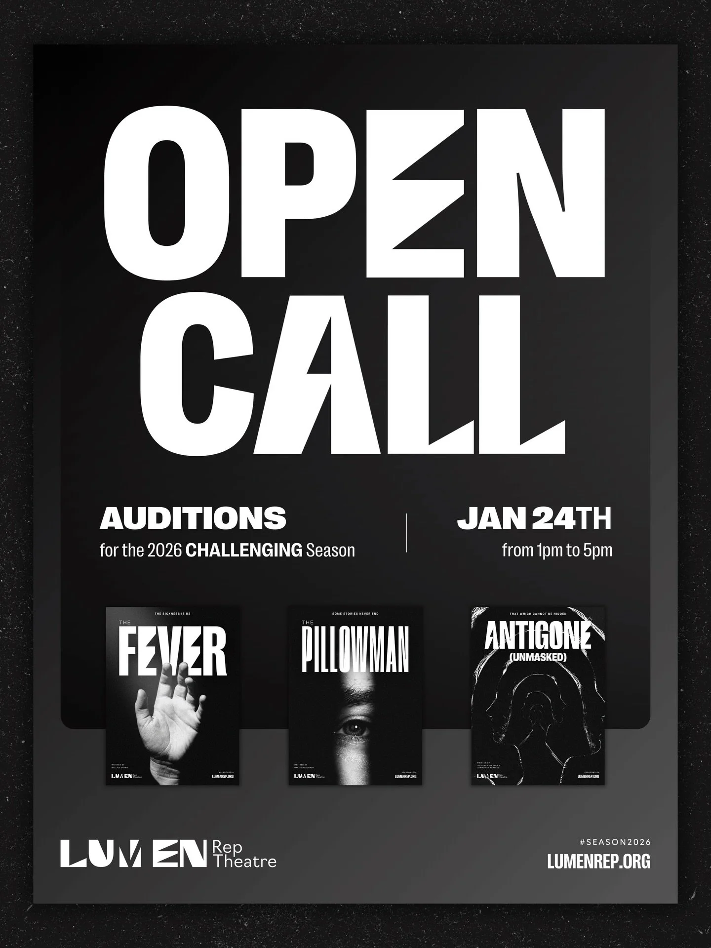 Lumen Rep is proud to bring this level of professional, Actors’ Equity theatre to Jacksonville. It’s a rare thing, and it matters. We believe this city deserves artistic endeavors that resource artists so that those artists can create things that provoke, question, and risk. Thank you for being part of it.